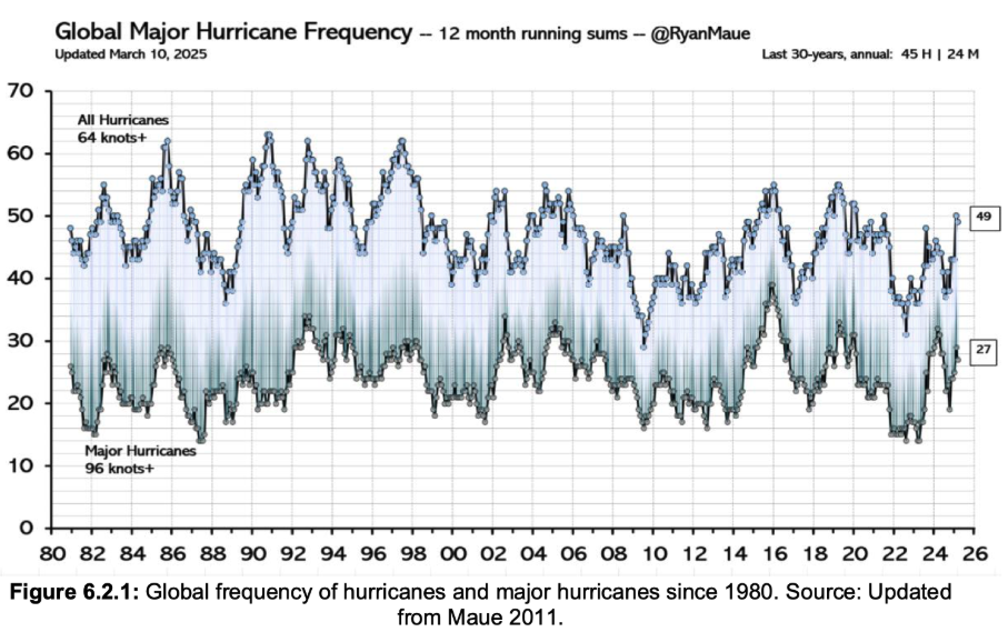 “Most extreme weather events in the U.S. do not show long-term trends,” the report states. “Claims of increased frequency or intensity of hurricanes, tornadoes, floods, and droughts are not supported by U.S. historical data.”
