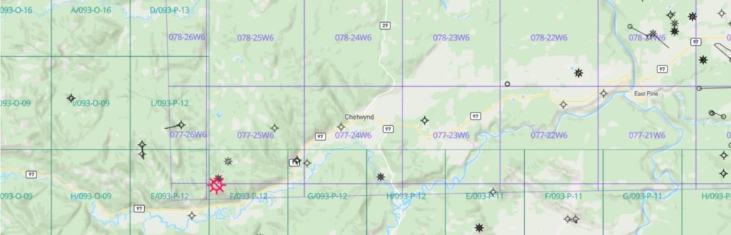 StackDX map for area around Chetwynd BC shows oil & gas development is historically present but not heavy and not close to the populated area. Until 2015, Chetwynd featured a large pulp and paper mill in the centre of town.