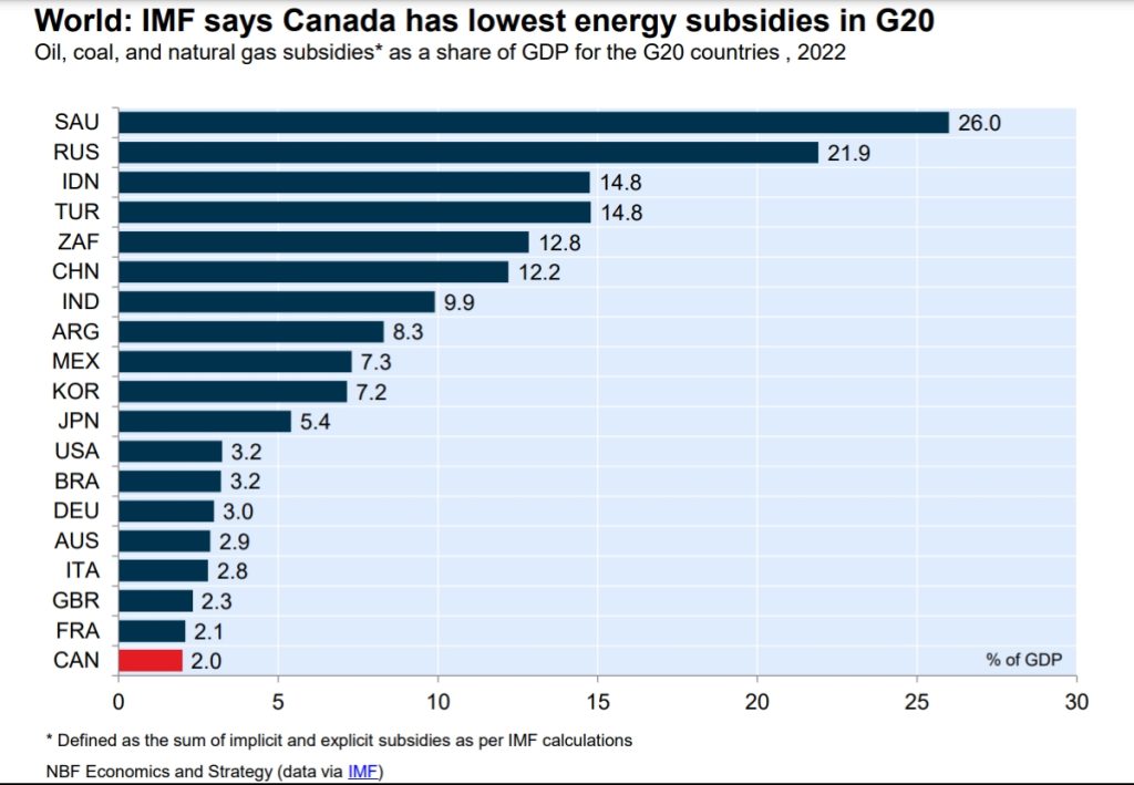 Yet, considering the National Bank of Canada’s latest hot chart using International Monetary Fund data, Canada doesn’t have a fossil fuel subsidy problem. In fact, at just 2 percent of GDP, we have the lowest subsidies of any G20 country, even behind those infamous petroleum pariahs like Italy and Germany.