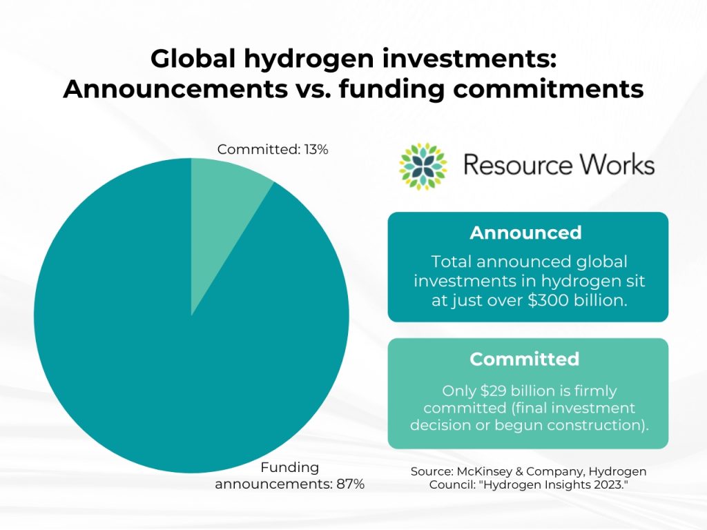 To date, total announced global investments in hydrogen sit at just over $300 billion. And of that, only $29 billion is firmly committed (i.e., companies that have made a final investment decision or begun construction).