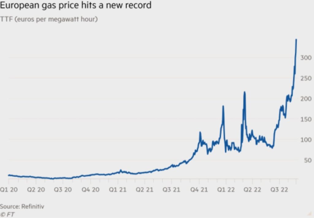 As domestic gas production tanked, there was no policy to ensure security of supply and an active policy to close the remaining production (thanks Greta). Oil of course is now imported as domestic production has fallen fast. Oil is trading at 2x its recent average price, gas is more like 10x (and has touched the equivalent of $500/bbl oil).