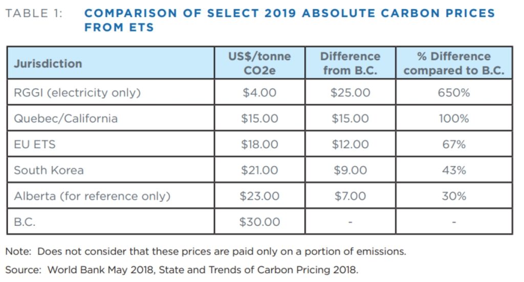 A similar opportunity – and challenge – exists for BC’s mining industry as the world strives for widespread electrification. The 2019 BC Mining Jobs Task Force identified ways in which BC can improve its system for carbon pricing, reducing emissions while protecting the province’s low-carbon supporting industries from international competitors with lower standards. Similarly, the Business Council of BC encourages BC to provide support to its traded industries—that is, industries that are export-oriented or compete with non-taxed imports, like mining. Here’s a table that helps put things in perspective (note that BC’s carbon tax is now $50/tonne).