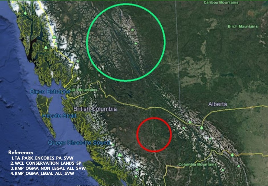 The green circle below represents all of the parkland in British Columbia, including various other types of protected areas like conservation corridors, ecological reserves, protected areas, and recreation areas. All told we have 16,784,548 hectares of such areas in BC. The red circle represents the total area included in BC’s over 37,000 OGMAs.