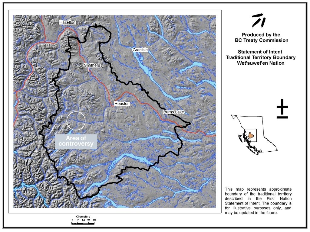 The following two maps are from the BC Treaty Commission itself. The site of controversy is added for clarity. The first map shows the traditional territory boundary of the Wet’suwet’en hereditary chiefs process: