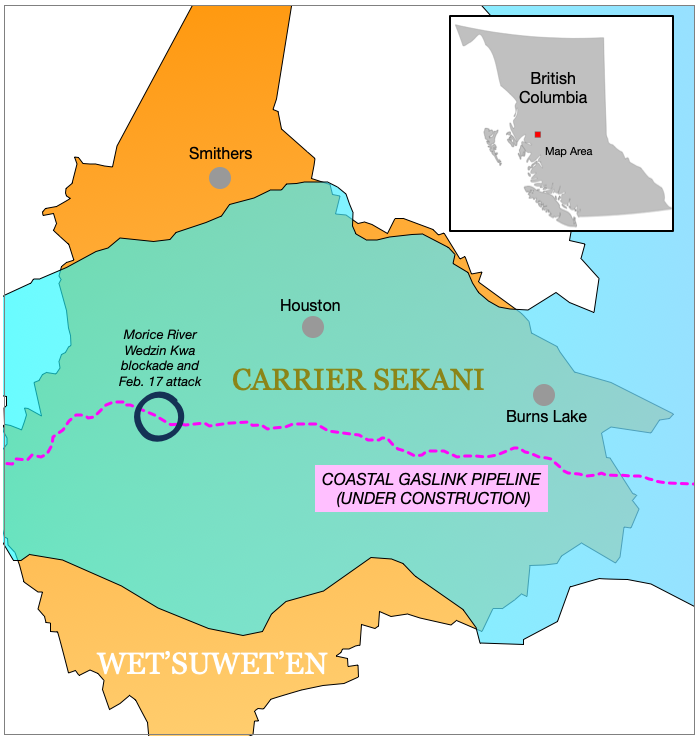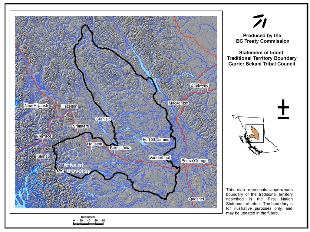 The following map includes the route of the Coastal GasLink pipeline currently underconstuction, and the claim area of the Carrier Sekani Tribal Council laid over top of the claim of the Wet’suwet’en hereditary chiefs’ claim: