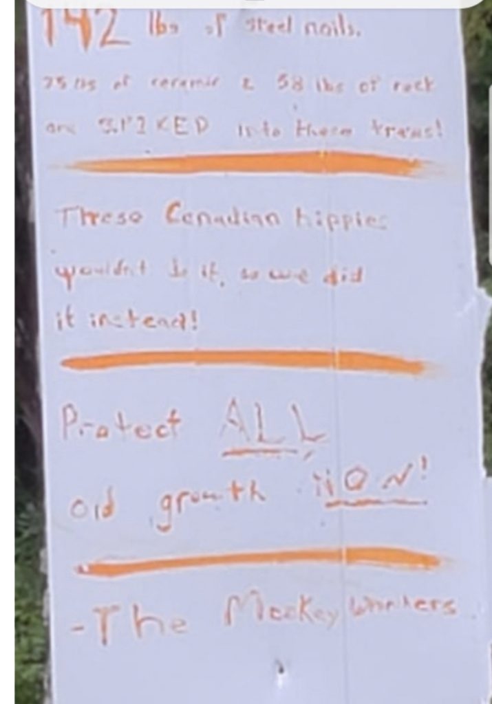 Meanwhile, another tactic that surfaced earlier this year has returned to Fairy Creek: tree spiking.
