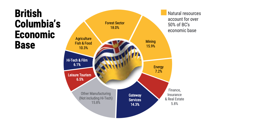 - Considering service exports in addition to goods exports reduces the percentage attributed to the natural resource sectors, but it should still be clear that our endowment of natural resources remains a primary source of B.C.’s wealth. Neglecting the health of these industries would come at the cost of our standard of living, impacting all British Columbians.