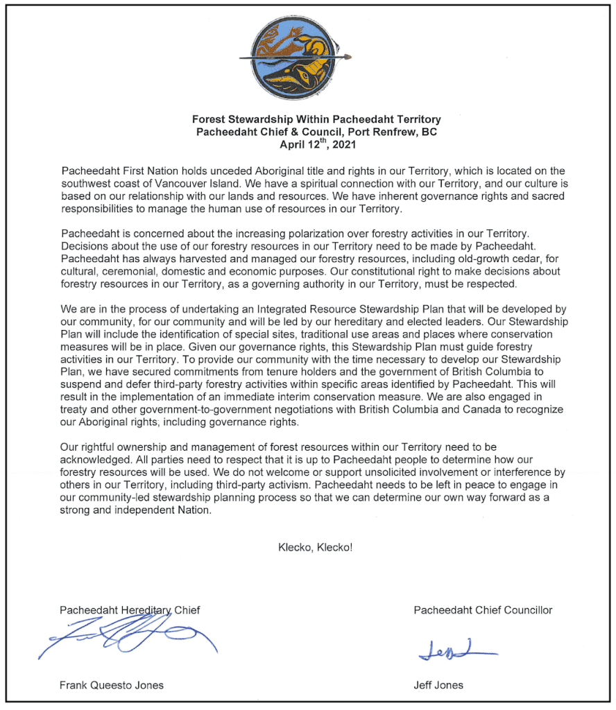 In fact, on April 12, 2021, the Nation issued a firmly worded statement that it does not welcome or support “unsolicited involvement or interference by others in our Territory, including third-party activism.” Both Hereditary Chief Frank Queesto Jones and Chief Councillor Jeff Jones signed the statement.