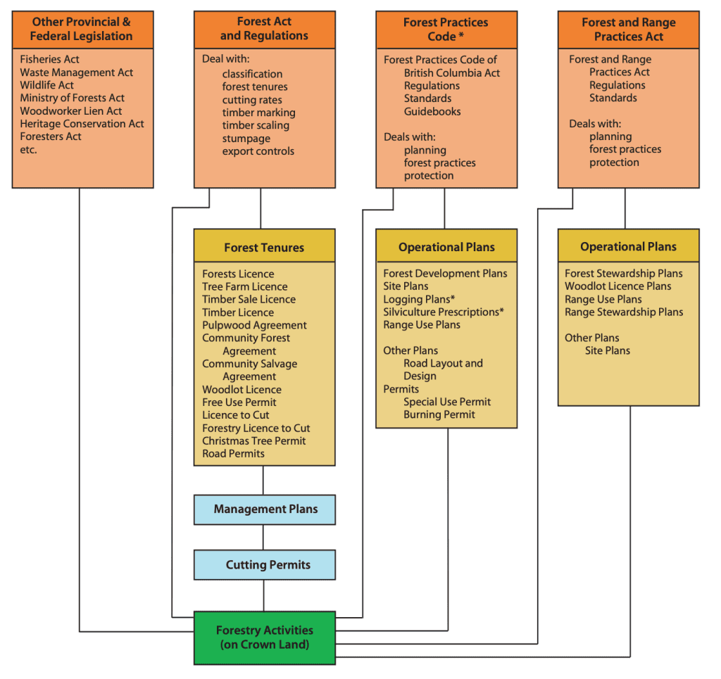 A lot of people will have the impression from ads like Wilderness Committee buys that forestry is some sort of a wild west situation. “Wanna be a lumberjack? Grab a chainsaw!” In fact, there is an entire ministry devoted to this one industry. It’s the only industry that can say this. Like any arm of government it exists to enact legislation by putting regulations into effect and applying them. In the case of forestry, the ministry’s various operations are so sprawling, and the challenges of getting permission to cut down so much as a single tree so great, that some enterprising individual a few years ago had to write an entire manual simply describing how the B.C. forests ministry operates, diagramming all of the steps required. The images below are drawn from that and provide an easy crash course in our forestry system. (Caveat: the material is a bit dated – new things we have today that should be shown include the Species At Risk Act, the Fisheries Act, the Forest Practices Board and third-party forest management certification.)