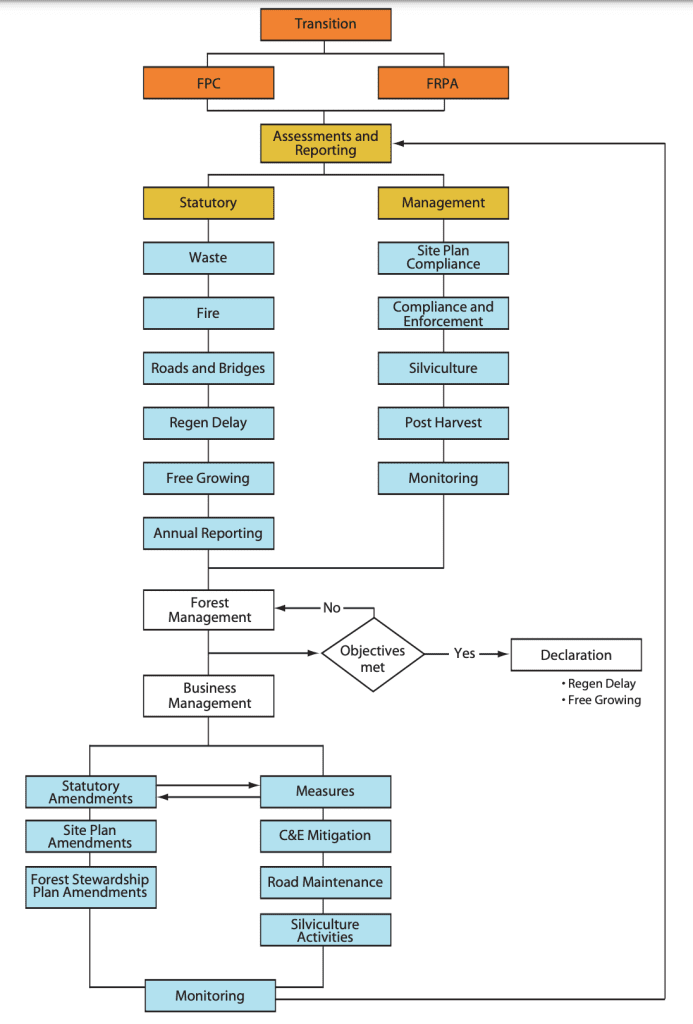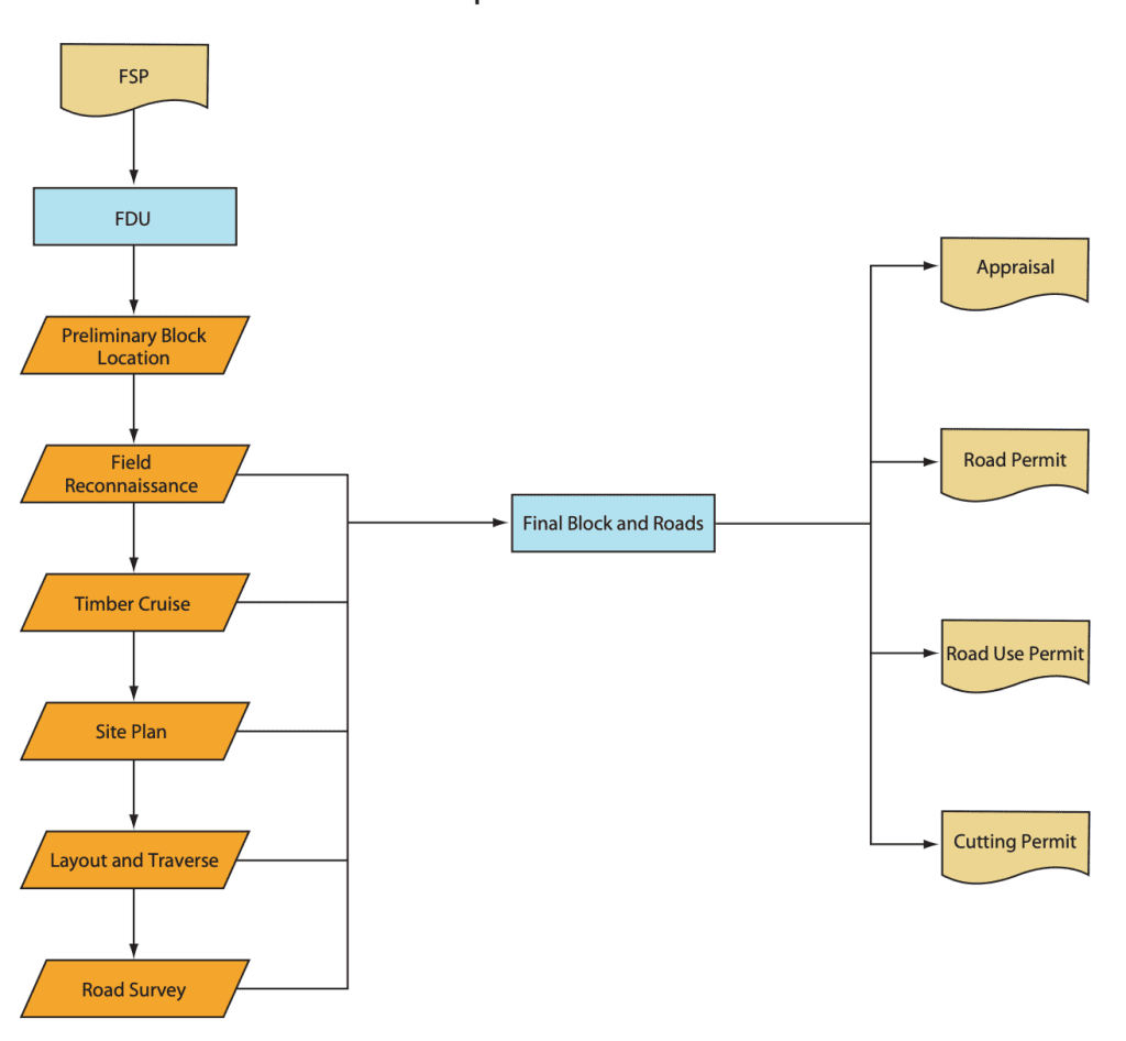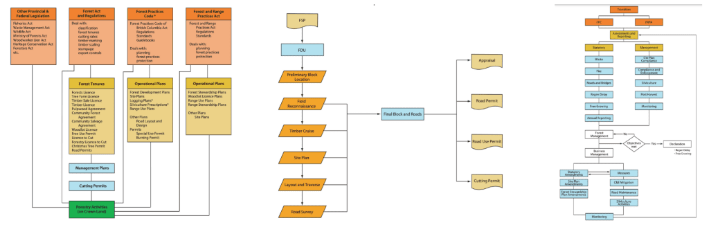 That’s the big picture. Now suppose you are a forest products company like Teal-Jones. You want to harvest timber to keep your employees working, and to do that you will have to first of all get permission. Here are the steps for that (and once again, these processes can change over time):