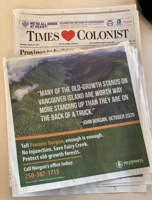 The advocacy organization that purchased this ad, Wilderness Committee, asked readers to make a phone call to Premier John Horgan’s office to say Fairy Creek has to be saved and that he should protect old-growth forests. The belief that the advertiser wishes to plant in the reader is that this expanse of trees will be annihilated if the premier does not act. The Fairy Creek Blockade page on Facebook states that “hundreds of hectares of old growth forest” will be clear cut if something isn’t done.
