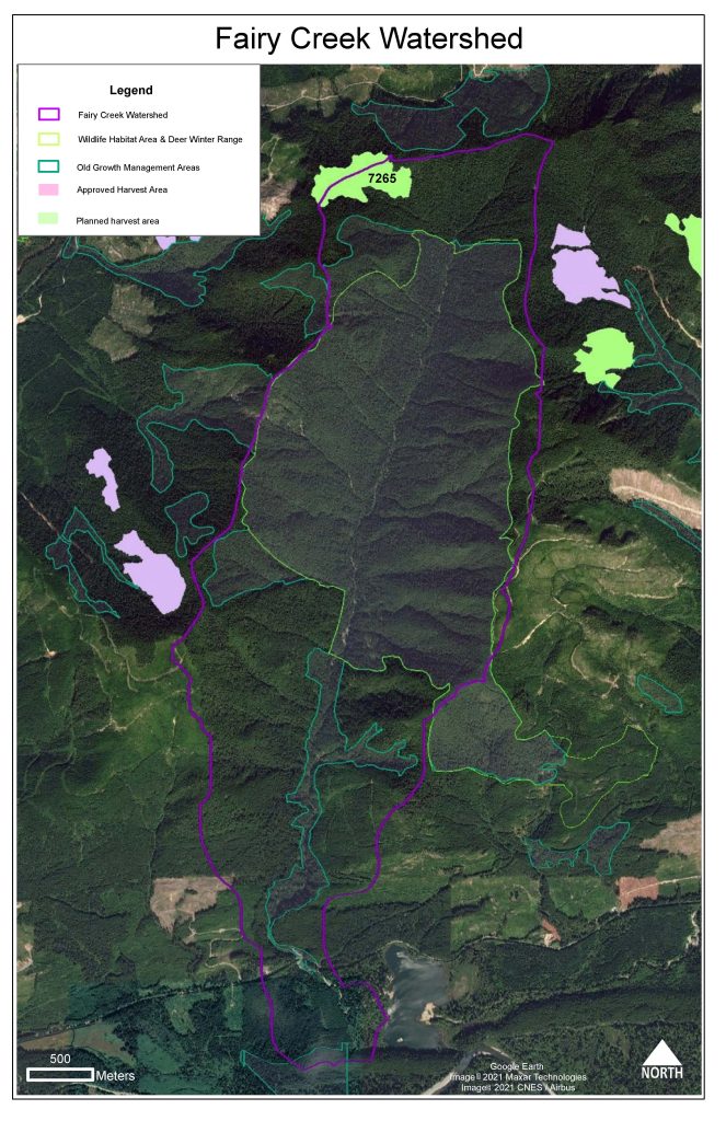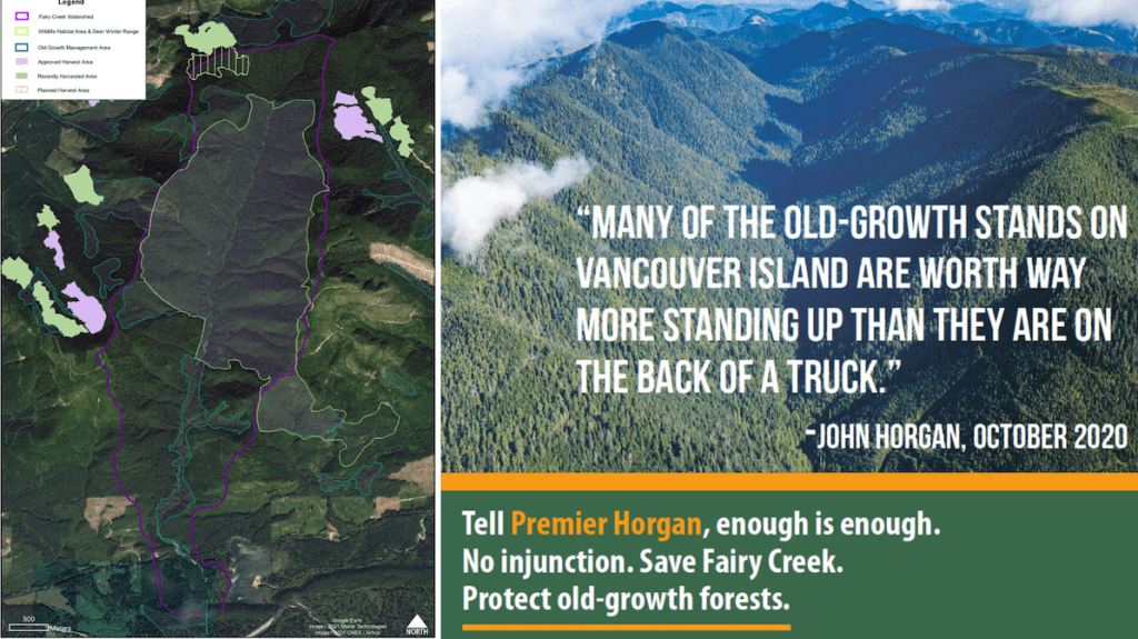 Here’s what the Facebook page of group Fairy Creek Blockade says: “If the judge grants the injunction they will be sanctioning the destruction of the last pristine valley on Southern Vancouver Island, with almost 3000 acres of unprotected old growth at risk in the Fairy Creek Rainforest.”