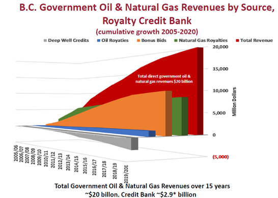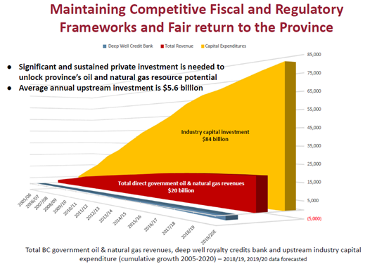 One of the ways that governments benefit when that process is successful is through royalties. Unfortunately for B.C., the past five years have seen low commodity prices for oil & gas, and this has meant low royalties to government. For critics, this raises the question of whether it’s really worth all the alleged social and environmental strife for such a pitiful return.