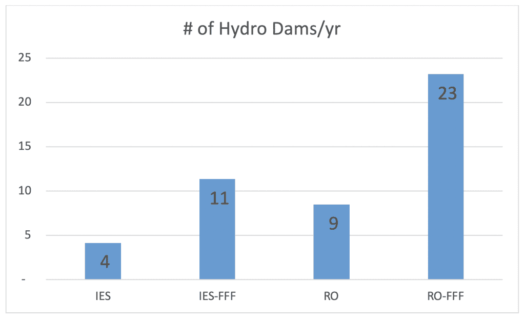 The profile of renewables varies significantly in terms of their reliability. This is a key safety issue: it’s just a fact of life that people die without energy when it’s 40 below, and we decided not to ignore this critical safety risk. Knowing solar and wind have to be backed up by natural gas, biomass, nuclear, coal or oil, we took a quick look at the implications if Canada developed on a 100% hydro pathway. For perspective, RO would require 255 new dams, and IES 125 new dams, each the size of British Columbia’s new Site C dam.