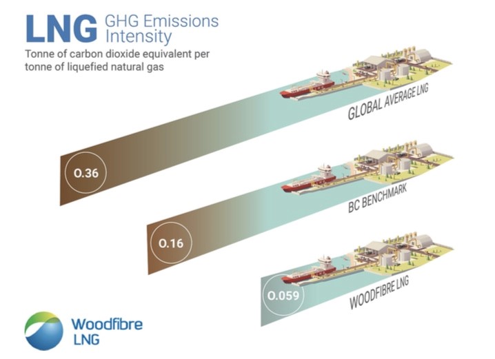 The global average for LNG plants is 0.36 tonnes of CO2 equivalent. Woodfibre LNG, the first planned LNG plant in BC to choose hydro power, will have an emissions intensity of only 0.059, thanks to that electric drive.