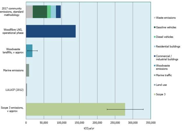 Moreover, the language of the recommendation suggests that it is correct to compare the emissions of a major industrial project, which will sell LNG produced with the cleanest standards in the world, with the community emissions of a municipality with 20,000 residents. As the District’s own Community Climate Action Plan acknowledges, the largest sources of emissions in the District are the people and businesses (scope 3), representing over a quarter of a million tons of CO2e/year – which puts the projected annual emissions of Woodfibre LNG (about 150,000 tons) in context.