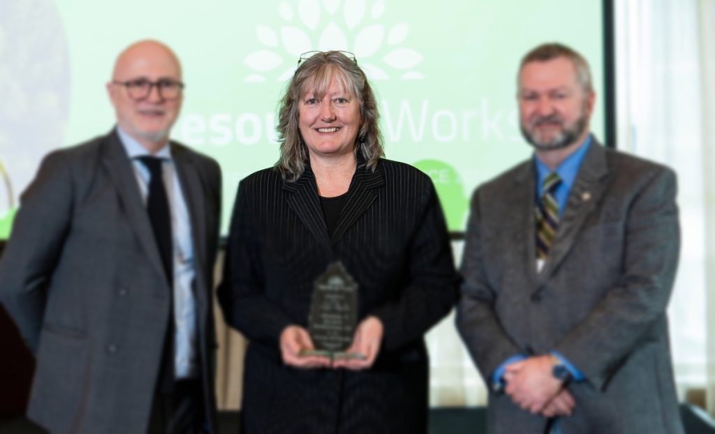 In April 2014, Dr. Anglin joined the Resource Works Society as Advisory Council Chair. Her contribution toward broader resource understanding was recognized in April 2019 when she received an award from Resource Works. She is shown below with executive director Stewart Muir (left) and board chair John Turner.