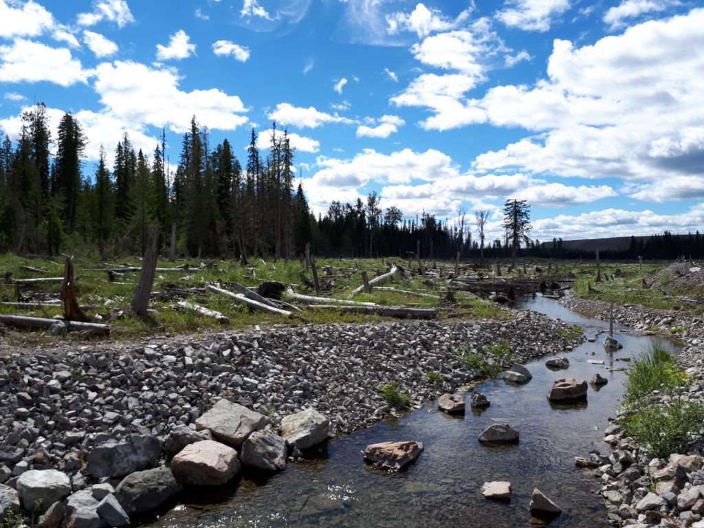 4. Upper Hazeltine Creek, July 2018, with coarse woody debris placed and vegetation planted, after tailings removed and channel rebuilt, by Mount Polley crews as part of the $70 million remediation program. Source.