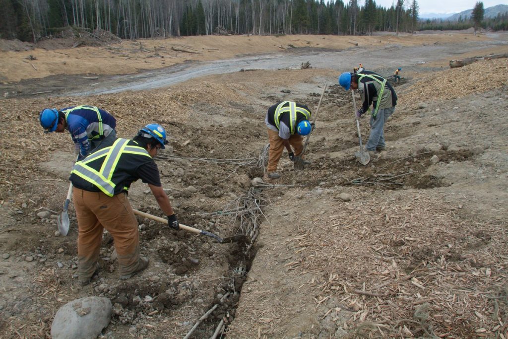 3. Photo of planting crew from Xat’sull First Nation (Soda Creek Indian Band) planting willow wattles in lower Hazeltine Creek, spring 2015, as part of Mount Polley’s remediation work. Source.