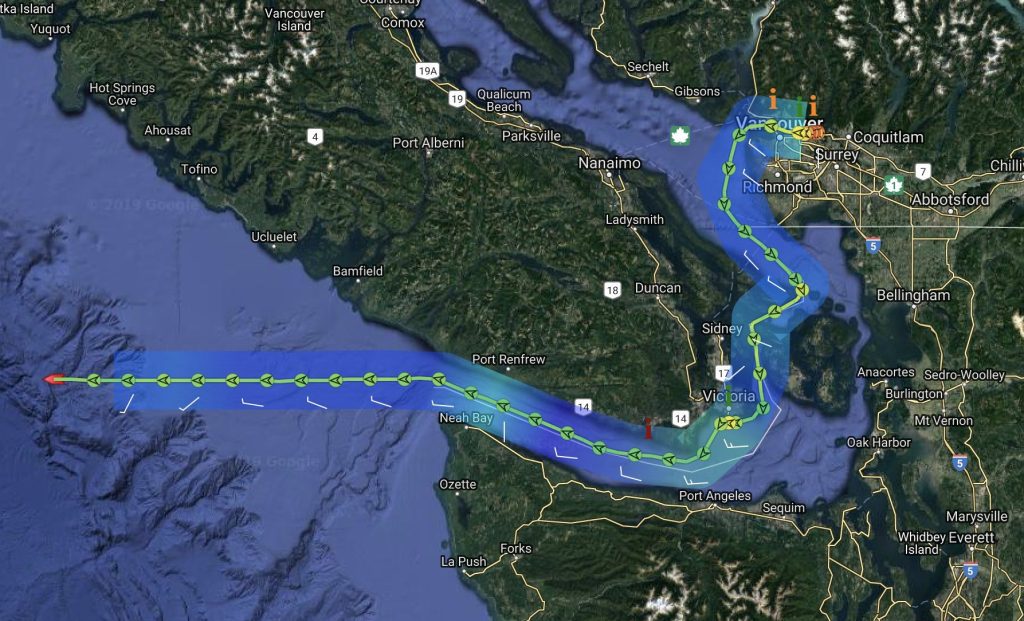 Below: By July 22, the STI Excellence has passed through the Straits of Georgie and Juan de Fuca and is making progress westward across the Pacific towards its destination: China.