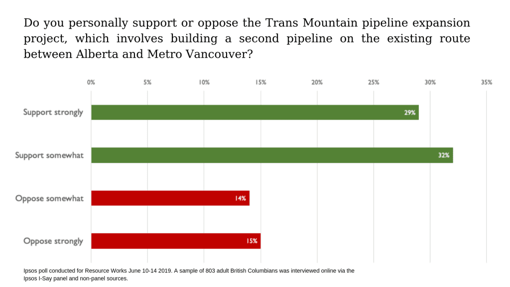 Resource Works sponsored a poll from Ipsos that was in the marketplace June 10 to 14, asking more than 800 British Columbians a simple, straight-ahead question: “Do you personally support or oppose the Trans Mountain pipeline expansion project, which involves building a second pipeline on the existing route between Alberta and Metro Vancouver?”