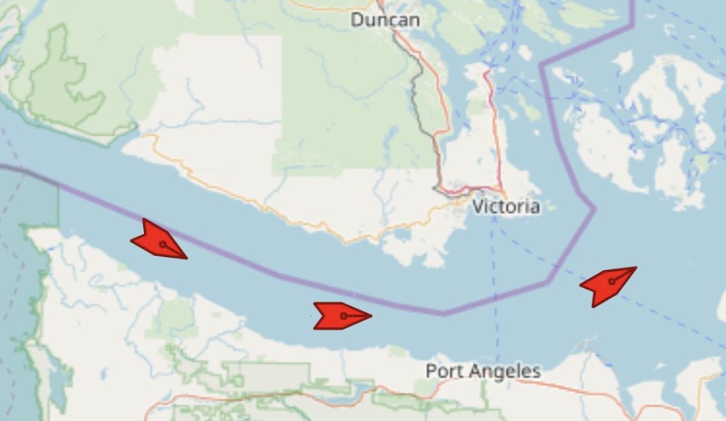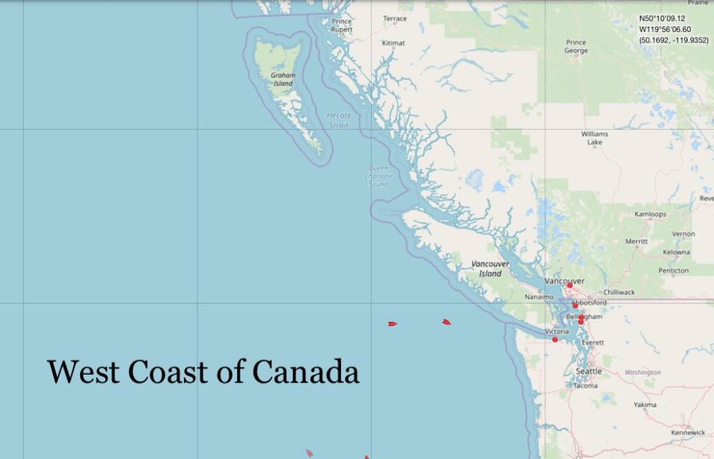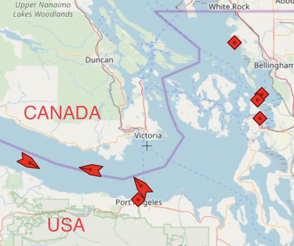 The map above shows that on the 23rd of March, all of the tanker activity in the Straits of Georgia and Juan de Fuca was on the American side of the border. Not a single tanker ship in Canadian waters.