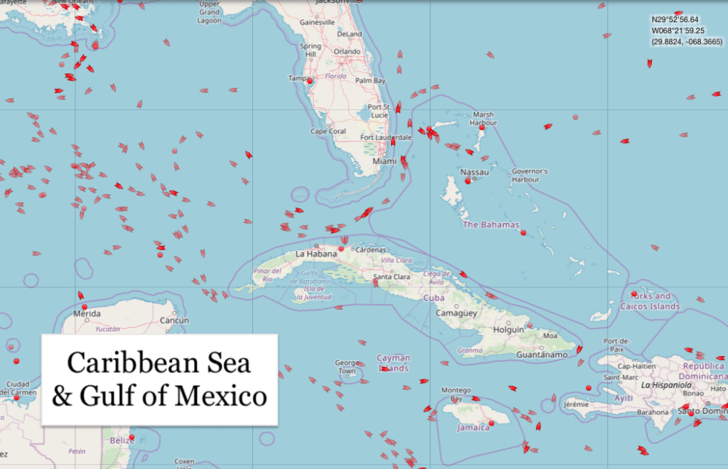My tweet: “For those who think tourism is incompatible with safely shipping one tanker of crude oil a day, isn’t it surprising that the hurricane-prone Caribbean remains one of the world’s great tourist draws? (The red symbols are tanker ships.) @MarineTraffic”