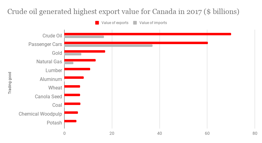 The chart below shows the value of exports versus imports for Canada’s high-value trading goods. The number one most valuable thing we sell to the world is crude oil, and most of that is shipped to the USA. Right now we’re hearing a lot about the fact that fair-market value is not being realized for this oil, because it is not being traded in the global marketplace where its true value can be realized.