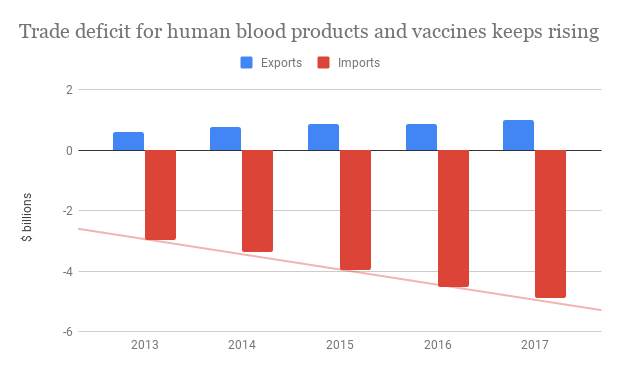 Crude oil is quite different. With oil, we keep more than 75 cents in our national pocket from every $1 earned in exports. That means more money to be used for things we need such as imported vaccines and blood products. That is actually quite a good example, because every year we spend more and more to bring those life-giving products in from other countries. In 2013, Canada spent $3 billion more on imported blood products and vaccines but exported less than $600 million worth, resulting in a trade deficit of $2.4 billion. Every single year since then, the deficit has climbed, so that by 2017 it reached $3.9 billion.