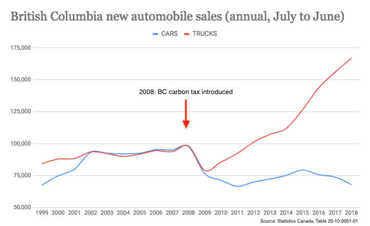 In the case of British Columbia, the 2008 introduction of the carbon tax coincided with a sudden, massive drop in the number of new cars and light trucks (including SUVs) sold, according to this data from Statistics Canada.