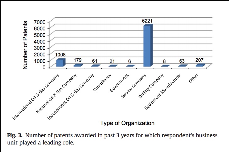- Reward success where it already exists (not just where someone dreams of it occurring). When it had the chance to invest a billion dollars in decarbonizing the oil and gas sector in Canada, the federal government said no to a supercluster proposal from Alberta, investing instead in a number of other proposals. Was the problem that Ottawa feared criticism for giving “subsidies” to the fossil fuel industry? If so, that is the wrong approach. The Canadian energy industry is actually doing an excellent job already of lowering its carbon footprint. For example, the GHG emissions intensity of production at Canada’s newest oilsands mine, Fort Hills, is currently on par with the average refined barrel in the United States, according to Suncor’s sustainability report for 2018. With a nationally supported plan, think how much more such companies could accomplish. A truly progressive government would be one that brings an oil-and-gas supercluster into the national innovation program. In the short term, we need to end the crisis of innovative Canadian oil and gas service companies exiting Canada’s hostile environment for the welcome embrace of American shale plays, because it is these service companies that far and away lead innovation in the oil and gas industry. The following chart shows patents awarded within the various sub-sectors of the oil-and-gas industry: