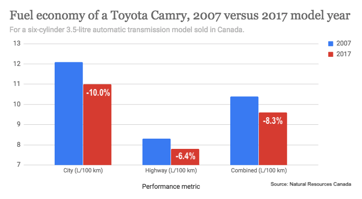 The improvement was not just because engines got smaller. Take the example of the plain vanilla Toyota Camry. The six-cylinder, 3.5-litre automatic was on sale for both model years 2007 and 2017. A decade of fuel-efficiency innovation brought surprising results, depicted in the chart here: a 10 per cent reduction in fuel use for city driving. (Natural Resources Canada collects this data here)
