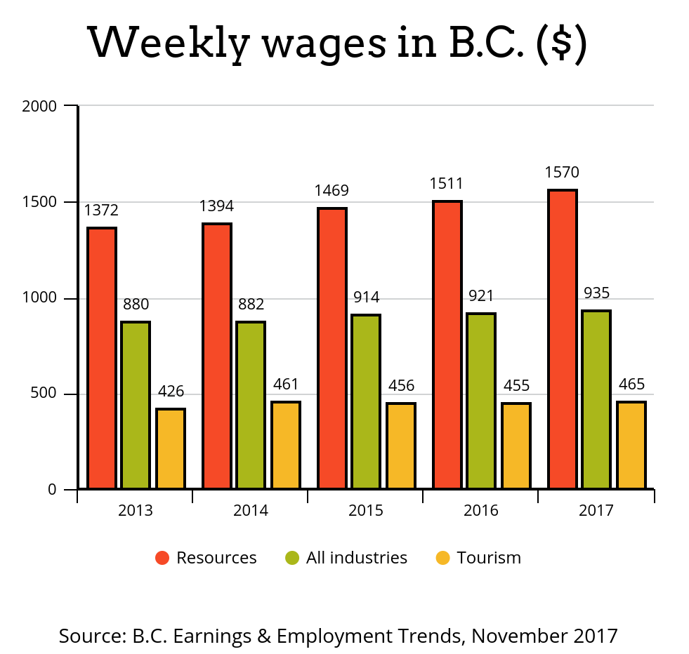 The wage of the average resource worker is the highest of any industry. In the 10 years to 2017, British Columbia’s resource workers saw their average weekly earnings climb from $1,120 to $1,569, an increase of $449. Compare that to workers in accommodation and food services – the backbone of the tourism economy. Those workers today earn $465 a week and have seen their weekly cheque grow by only $72 over a decade. Many of these earners no doubt prosper through tips, but as a growth story tourism comes nowhere close to resources in creating mortgage-sustaining jobs.