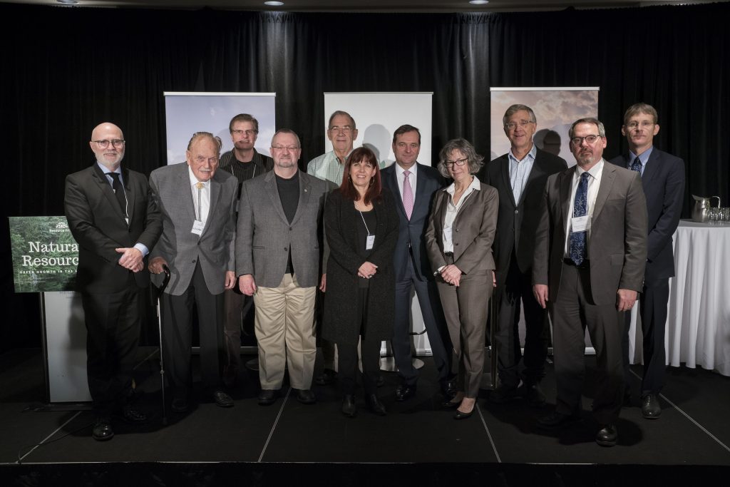 Members of the Resource Works board and advisory council on the podium with panellists for the event.