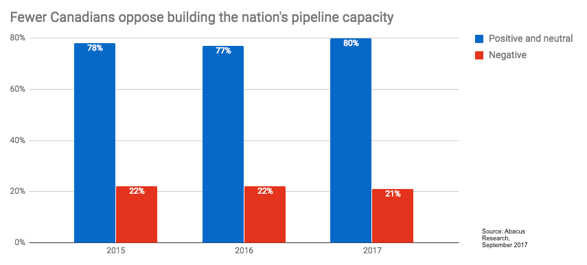 Perhaps a result, the share of Canadians opposed to new pipeline investment has actually fallen in 2017.