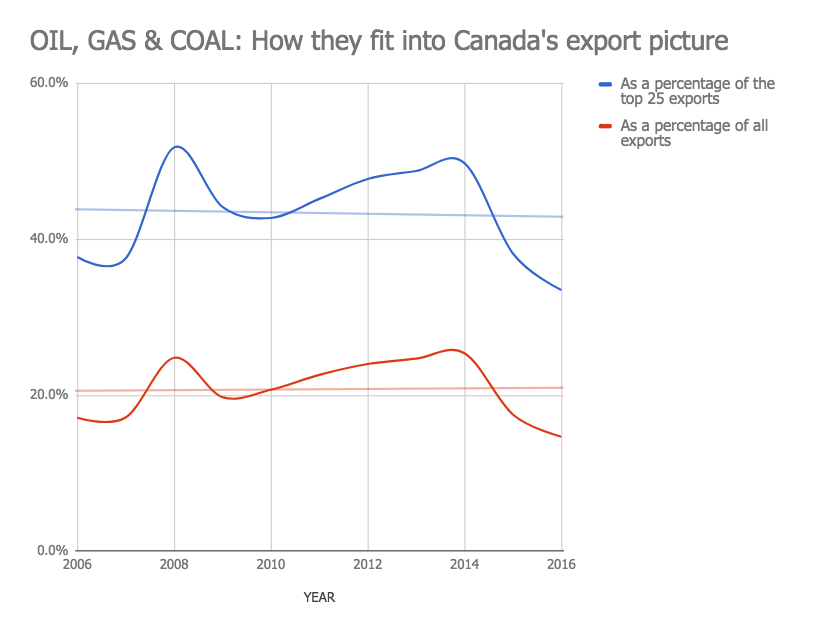 The data plainly show that we have a large and growing reliance on these industries. Between 2006 and 2016, the value of hydrocarbon exports topped the $1 trillion mark. Of our 25 top export categories, they have accounted for as much as 49 per cent of the total value. In 2016, about 1/3 of the top-earning export categories were hydrocarbon products.