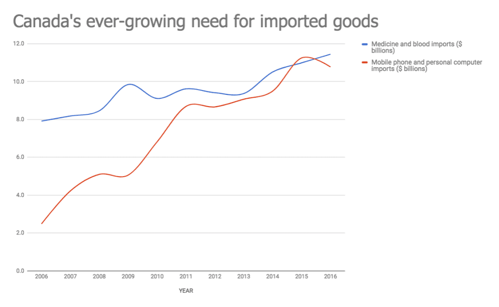 With the dominant role played by energy exports, there is a clear connection between them and these essential imported goods that can make the difference between life and death for millions of Canadians.