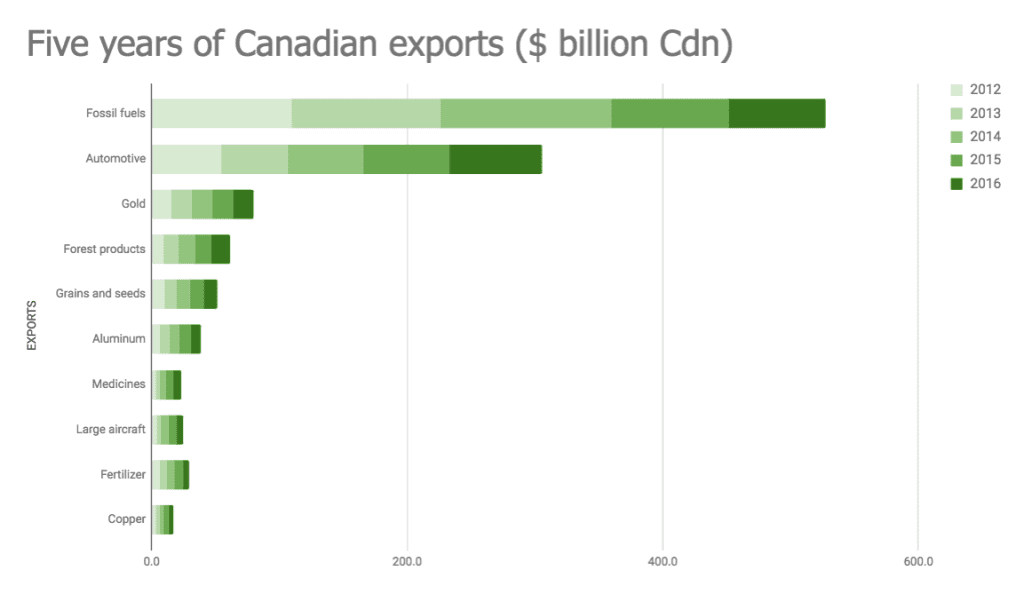 Exports of fossil fuels – crude oil, other petroleum oils, natural gas and coal – make up 45 per cent of this elite basket. Canada does need to continue improving its environmental performance through innovation. Canada cannot afford to stop exporting resource commodities. Nor is it desirable to do so, as that will only increase the market share for similar products from jurisdictions that are socially and environmentally unsustainable.