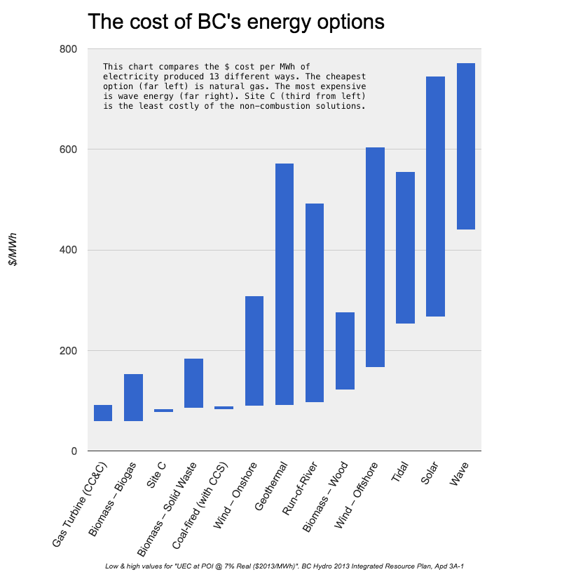 Produced from BC Hydro data (see this report, page 193), the chart shows that the three cheapest options are gas, large-scale hydro and coal.