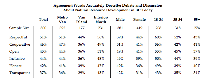 However, the poll also indicates there is still much to do to convince British Columbians that the debate over natural resource development is honest and transparent, particularly in the Greater Vancouver area.