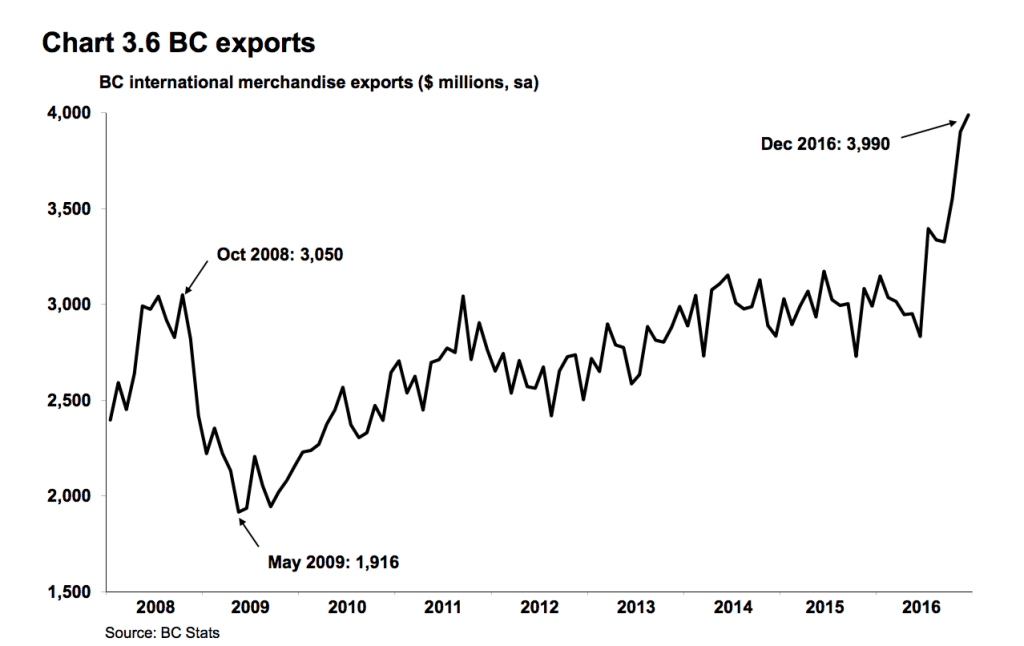 This chart presented in budget documents shows the dramatic story of merchandise export growth in 2016, a true resource story since about three quarters of these exports consist of resource commodities: