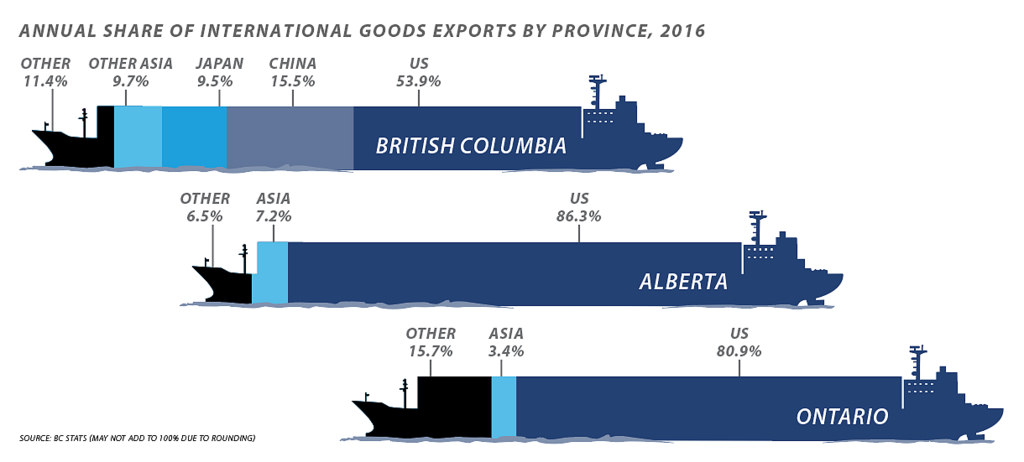 Seven of BC’s top 10 export markets are already in Asia and Australasia, and in 2016 they accepted $14 billion worth of BC exports in contrast to the $22 billion sent to the US and the two European nations on the list.