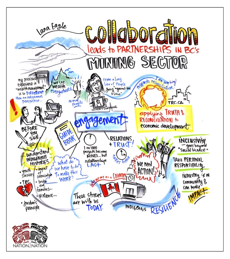 This live drawing by Sam Bradd of Drawing Change captured the text and spirit of Lana’s talk at the Fall 2016 Nation2Nation event. Lana Eagle is an indigenous relations strategist and president of the Industry Council for Indigenous Business.