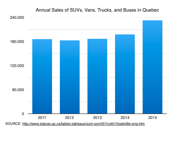 Take the example of Quebeckers’ growing willingness to drive gas guzzlers. In 2011, according to Statistics Canada, they purchased 186,078 trucks, SUVs, minivans, vans and buses. Last year, that number grew to 232,898. That’s an astonishing increase of 47,000 a year. Every year for the past three, the number has risen by thousands. Where do the magic fuel ingredients come from for these vehicles? “Just go electric!” is an inane answer in 2016. It seems that Mayor Coderre has no interest in this question, nor do the protesters, nor do environmentalists in Quebec, Alberta or elsewhere.