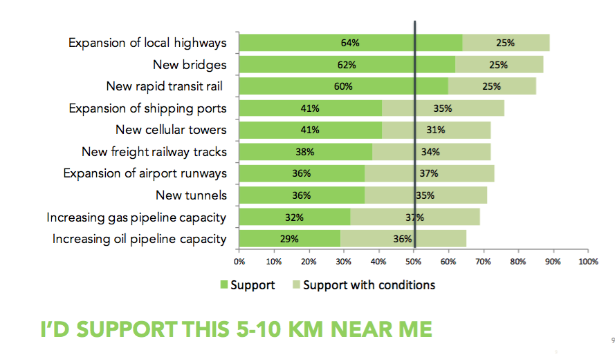 In all cases, majority support exists when conditional support is included. Oil pipelines are not an exception: rapid transit, cellphone towers and wind farms get the same treatment.