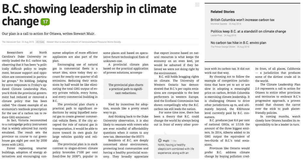 Not surprisingly, Canada’s middle-ground editorialists say much the same as our Stewart Muir. Check out what they had to say about the new BC climate plan: Vancouver Sun Calgary Herald Macleans Tom Fletcher