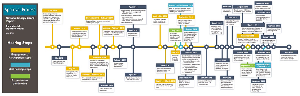 To recap the process so far, this diagram from the National Energy Board shows the steps that occurred during the approval process up until May 2016, when the project got its green light: