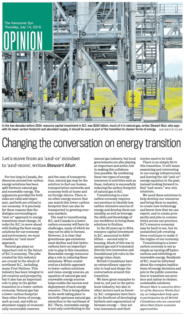 Stewart Muir is a Canadian resource dialogue leader whose ideas on energy are helping to elevate the Resource Works profile in crucial conversations. This commentary article (link to it at Vancouver Sun’s website here) looks at an inclusive approach to practical and desirable energy solutions.