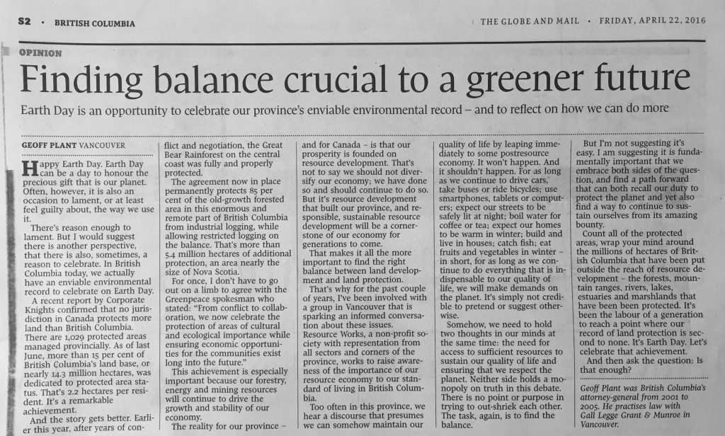 Count all of the protected areas, wrap your mind around the millions of hectares of British Columbia that have been put outside the reach of resource development – the forests, mountain ranges, rivers, lakes, estuaries and marshlands that have been been protected. It’s been the labour of a generation to reach a point where our record of land protection is second to none. It’s Earth Day. Let’s celebrate that achievement.