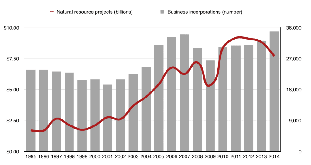 Over the past two decades there has been a tight correlation between annual capital spending for resources and business start-ups. Whether upward or downward, it is clear that resources spur individuals to start new businesses because of the demand for goods and services for these massive investments. Those involved in chambers of commerce will readily understand the correlation, but it is something more people should know about.